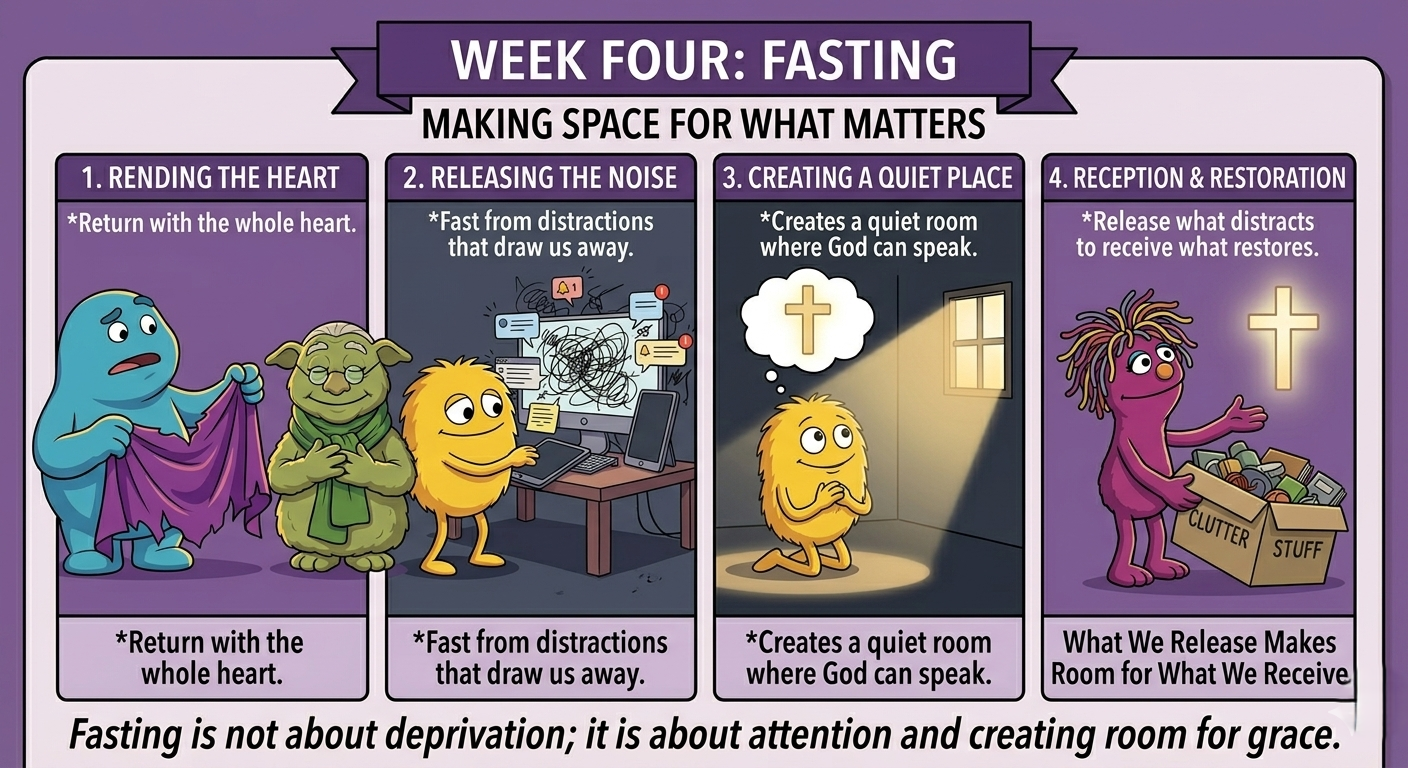 Fasting is not about punishment; it is about making space. Joel reminds us that God isn't interested in outward displays of devotion, but rather a heart that is open, honest, and willing to return. Fasting is the practice of releasing what distracts us so we can receive what restores us, a holy clearing-out of the soul.